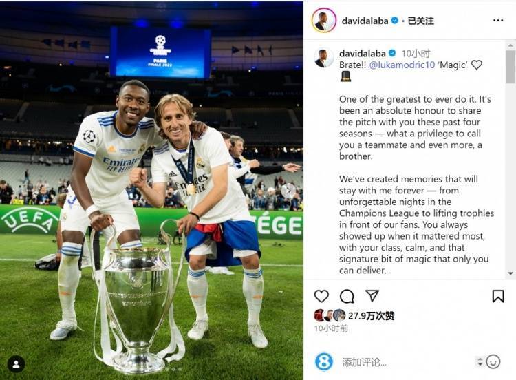 直播吧5月23日讯 马官方宣布,莫德里奇将在世俱杯之后离队,阿拉巴社媒发文致敬。